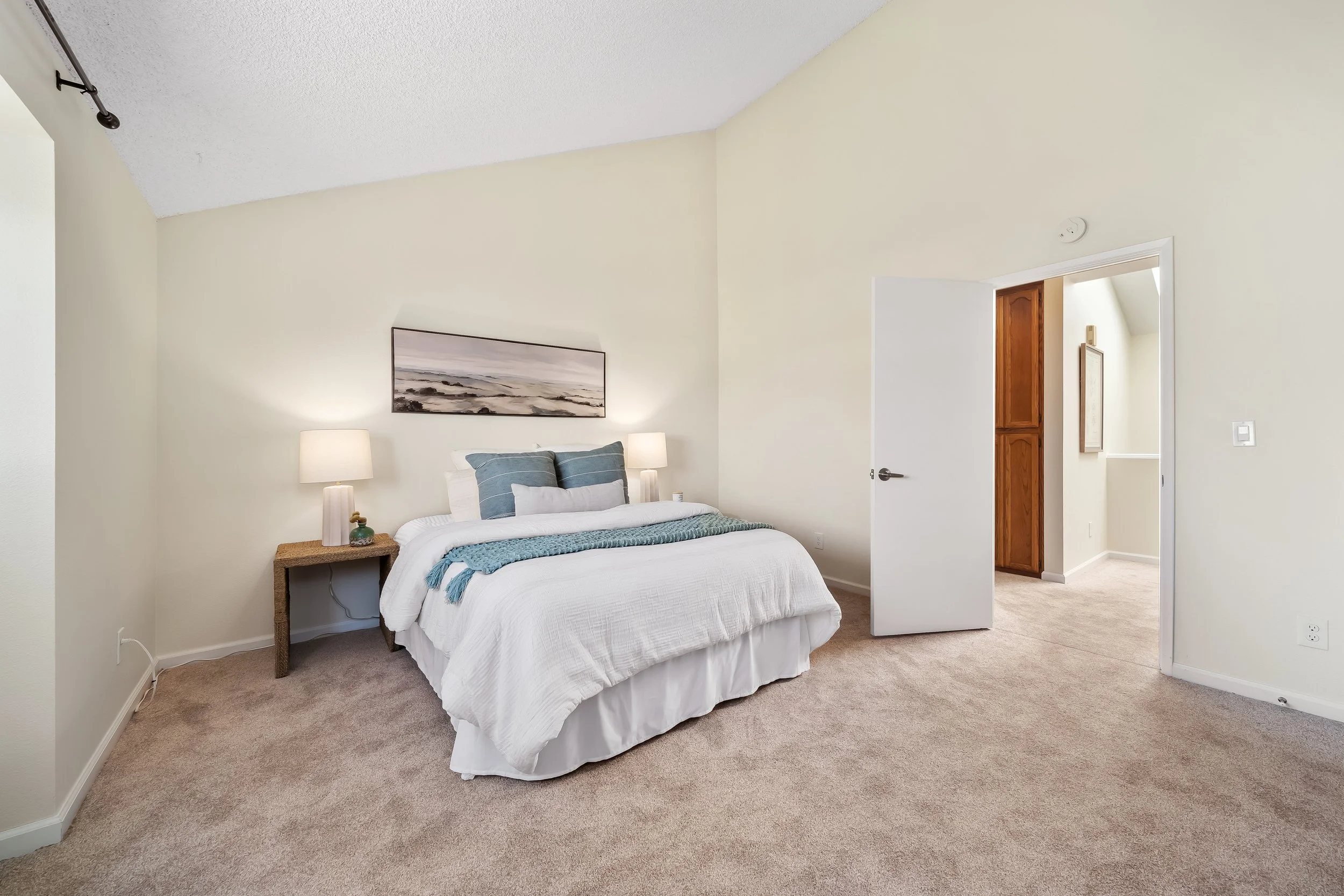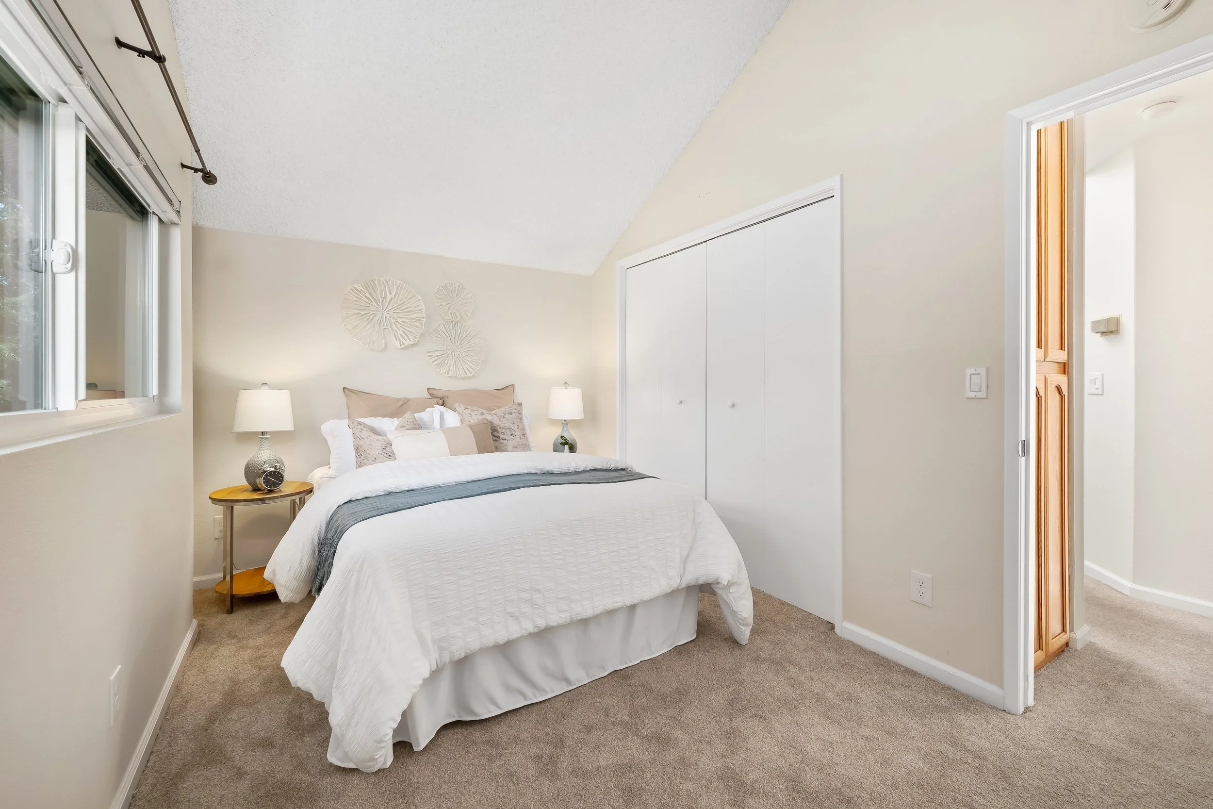 Upstairs, relax in two spacious bedrooms with soaring cathedral ceilings. The primary bedroom boasts an expansive walk-in closet, ensuring ample storage space. In the second bedroom, you’ll find the cutest ladder, leading up to what was originally used as a reading nook for the developer’s daughter.